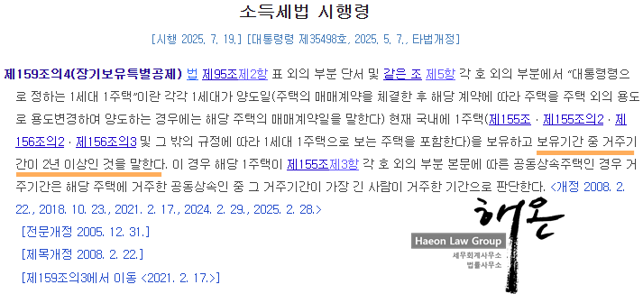 하지만 같은 소득세법 시행령에서, 거주기간은 “보유기간 중 거주기간”으로 명기하고 있기에, 과거 조문에서 거주기간이 재기산 되면서 보유기간도 함께 새로 시작하였던 것입니다.