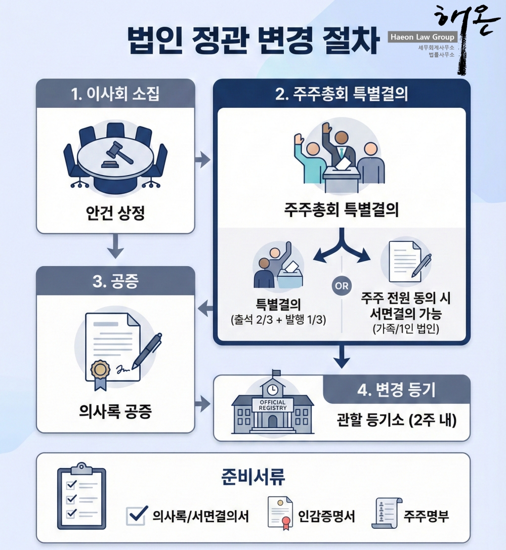 • 엄격한 절차: 정관 변경은 주주총회 특별결의를 원칙으로 하되, 주주 전원 동의 시 서면결의로 간편하게 대체할 수 있습니다.