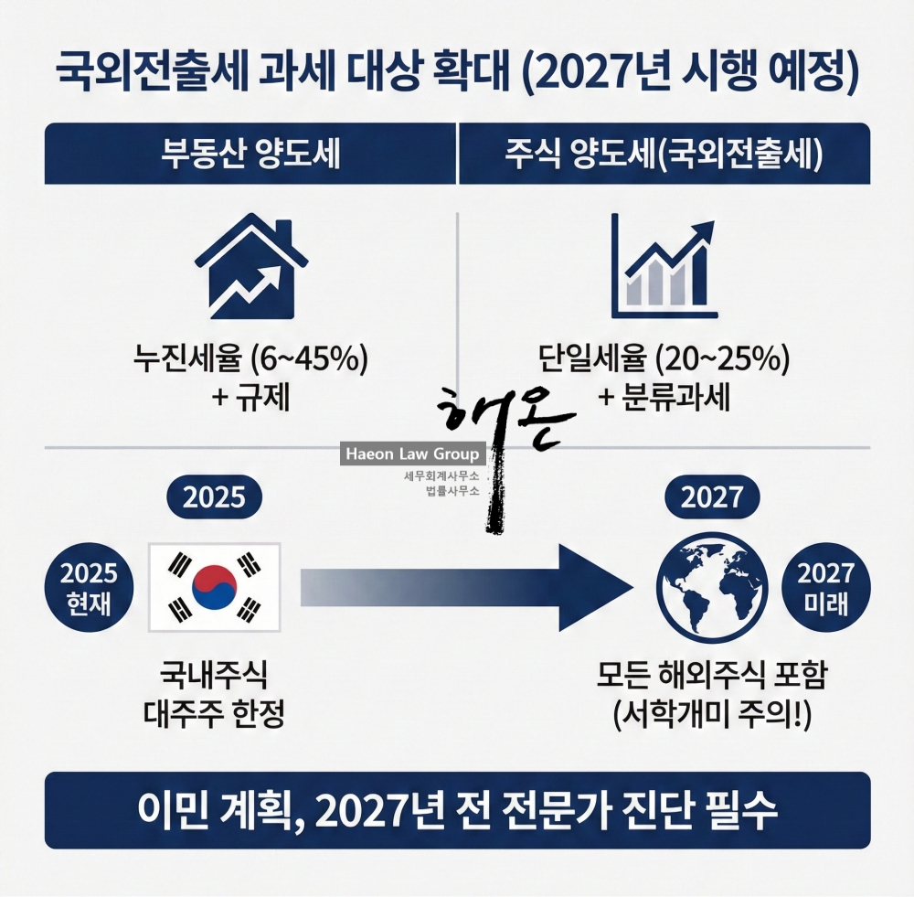 • 2027년 개정: 국외전출세 대상이 국내 대주주뿐만 아니라 모든 해외주식 보유자로 확대될 예정입니다.