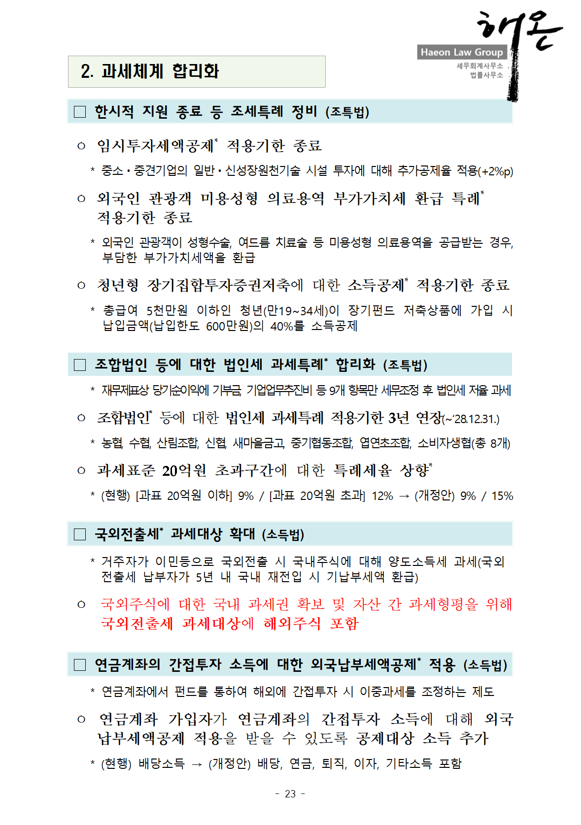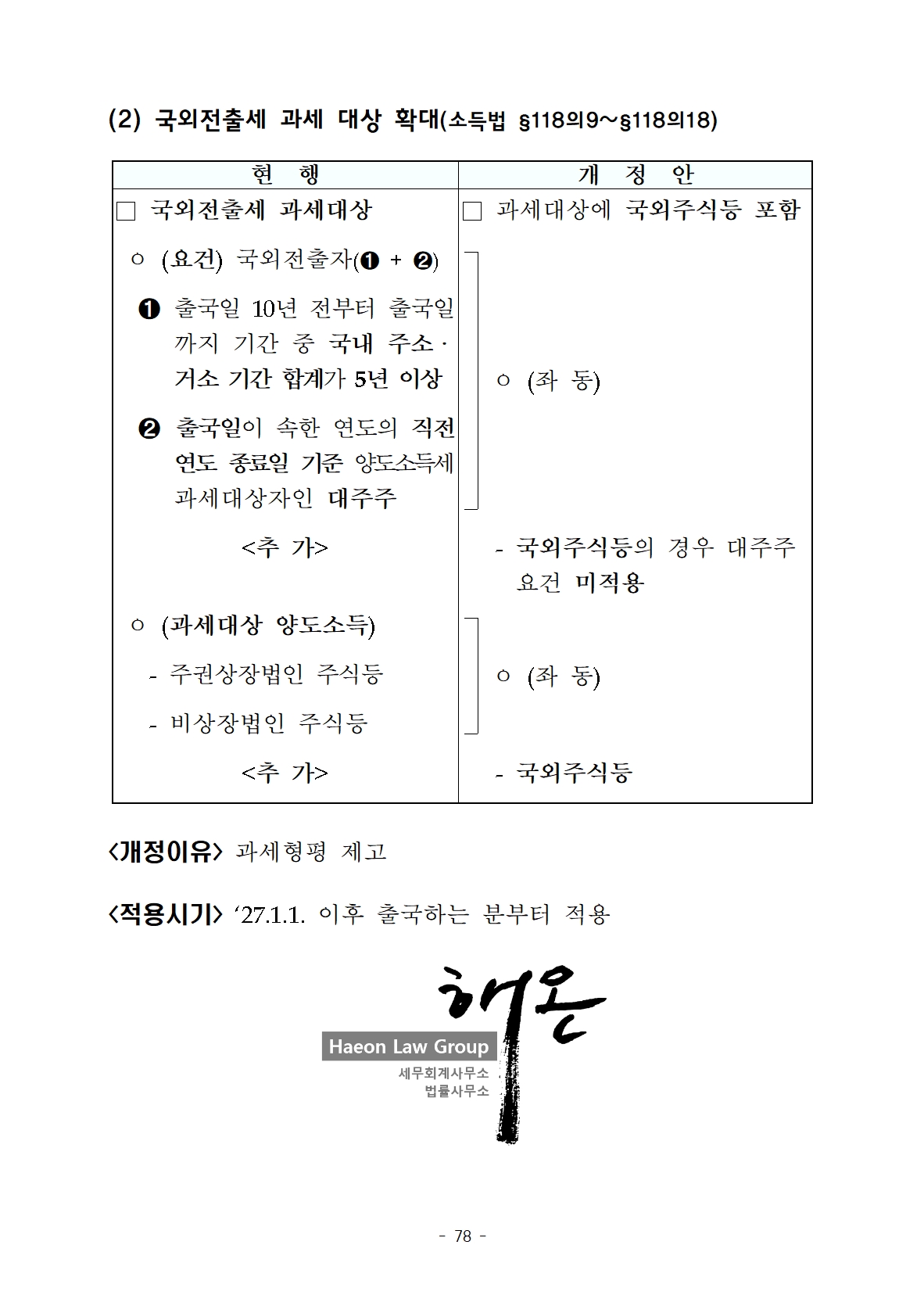 국내 비상장법인의 경우 현행 세법으로도 국외전출세 대상으로 개정 소득세법이 대표님의 국내 비상장법인 국외전출세에 미치는 영향은 없습니다.